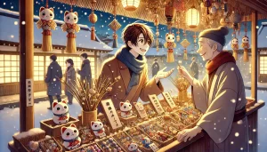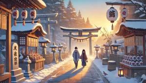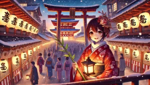 People visit shrines, receive lucky bamboo branches, and enjoy festival food. The atmosphere is lively and warm, even in the cold winter season.
