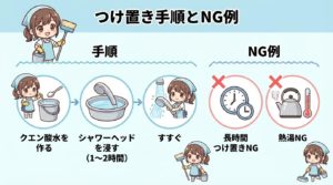 ただし、有効かどうかと、どの製品にも安全かどうかは別問題です。シャワーヘッドの構造や素材によっては、水没や酸性洗剤が不向きな場合があります。自己判断で長時間つけっぱなしにするより、「説明書確認→短時間で試す→すすぎを徹底」の順で進める方が失敗しにくいです。