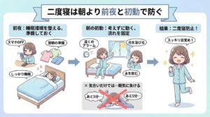 - 二度寝防止は「朝」より「前夜の準備」が重要