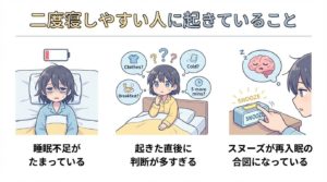 二度寝が多い人は、意志が弱いというよりも、再び眠りやすい条件がそろっていることが多いです。まずはその状態を整理してみましょう。