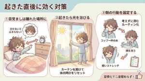 二度寝を防ぐためには、起きた直後の1分間がとても大切です。ここを固定すると、寝直しする余地が減ります。
