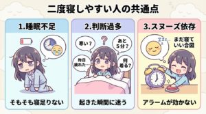 よかれと思ってやっていることが、実は二度寝を強化している場合もあります。ここも押さえておくと、改善しやすくなります。